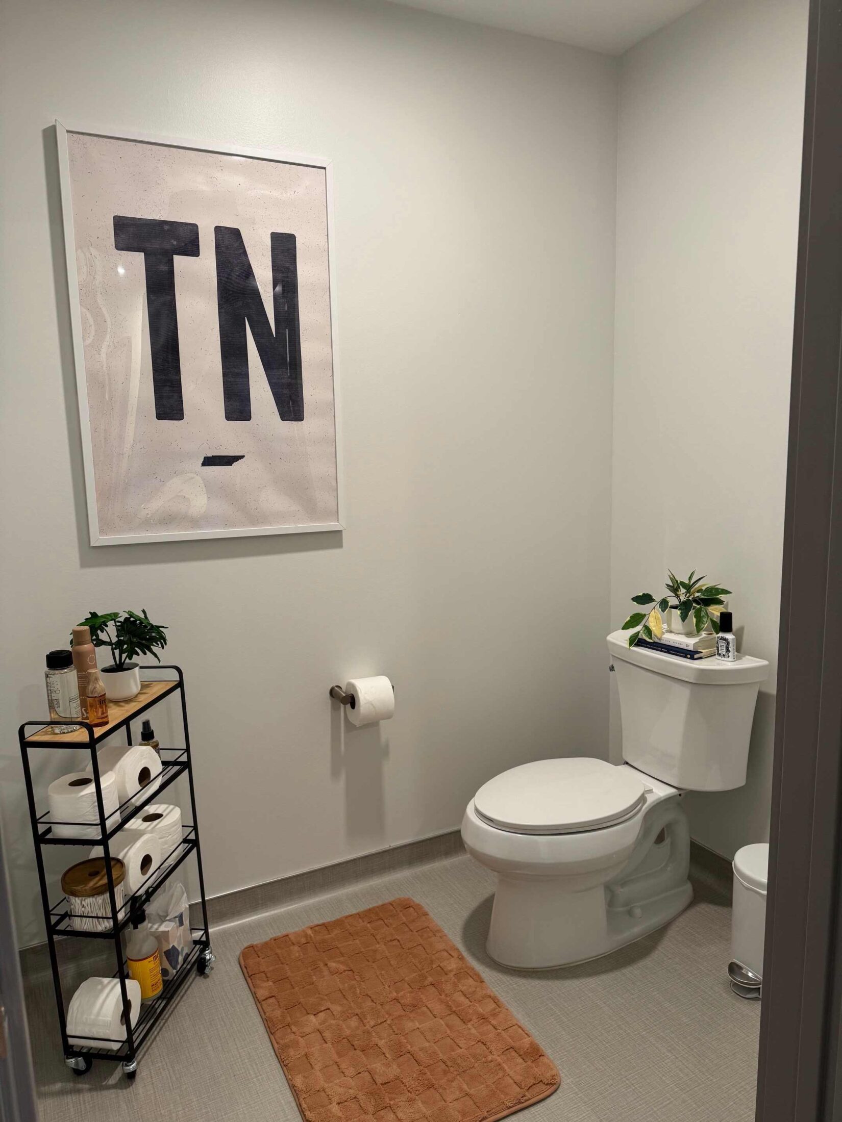 - 12″ space in bathroom next to the toilet in a 4-person suite. Note: The floor has sloped corners.